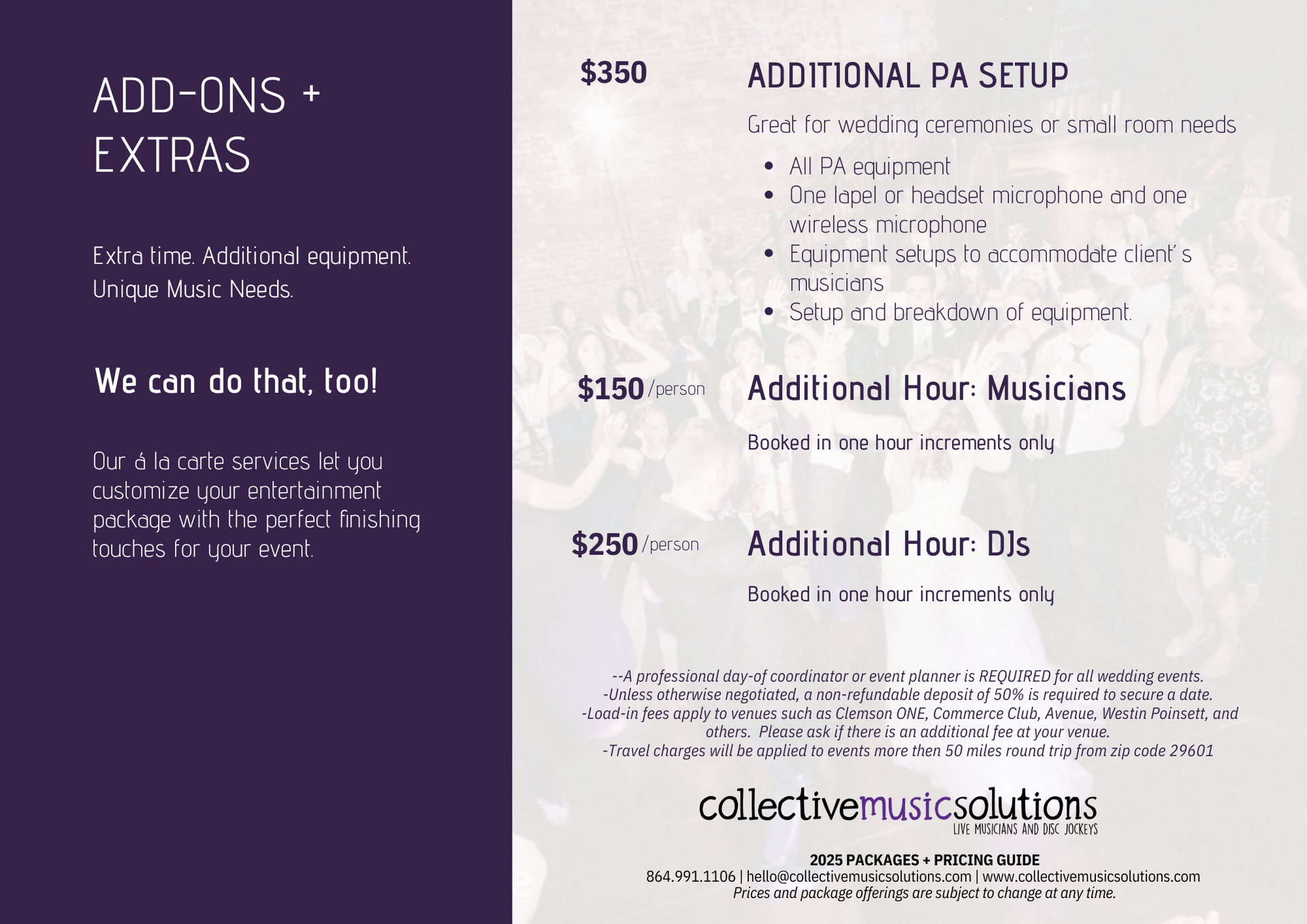 Our packages include both live music and a DJ. We always welcome the opportunity to create specialty packages if you don’t immediately see what you’re looking for.